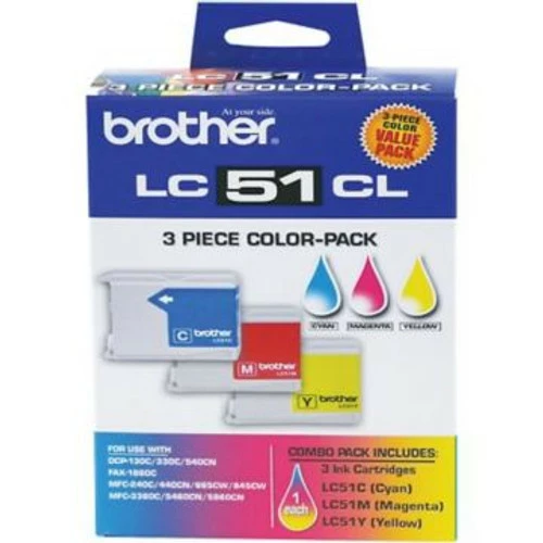 The Brother LC51CL Cyan, Magenta, Yellow Ink Cartridge is designed to work with DCP-130 C, DCP-330 C, DCP-350 C, DCP-353 C, DCP-540 CN, DCP-560 CN, DCP-750 CW, DCP-770 CW, MFC-230 C, MFC-240 C, MFC-3360 C, MFC-440 CN, MFC-465 CN, MFC-5460 CN, MFC-5860 CN, MFC-660 CN, MFC-665 CW, MFC-680 CN, MFC-685 CW, MFC-845 CW, MFC-885 CW, FAX-1860 C, FAX-1960 C, FAX-2480 C, IntelliFax 1860C, IntelliFax 1960c, IntelliFax 2480C, IntelliFax 2580C, printer models.